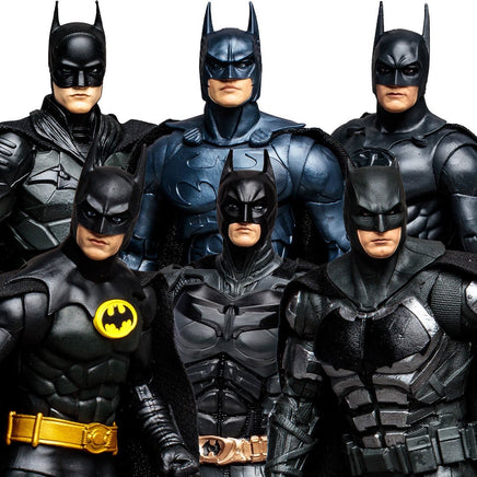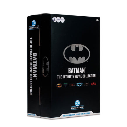 The DC Multiverse WB100 Batman The Ultimate Movie Collection 7-Inch Action Figure 6-Pack includes 6x Batman action figures based on the movies Batman v Superman: Dawn of Justice, The Dark Knight, Batman and Robin, Batman Forever, The Batman, and Batman (1989).
