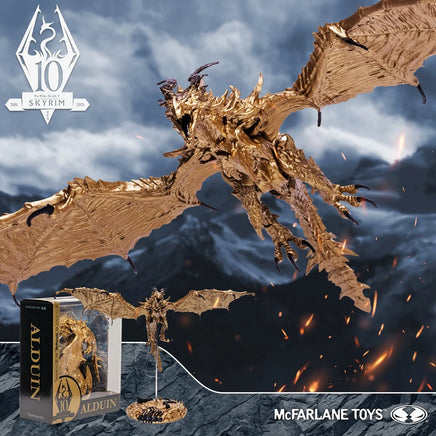 Celebrate the 10 year anniversary of adventuring in Tamriel with the harbinger of the apocalypse! Bethesda Game Studios' critically acclaimed role-playing video game, The Elder Scrolls V: Skyrim,tasked the Dragonborn with defeating Alduin. This Elder Scrolls V: Skyrim Alduin Gold 10th Anniversary Version Action Figure showcases the dragon with a stunning gold finish. Alduin's massive wings feature up and down movement and span 15-inches wide. With 10 points of articulation, he has a bendable tail, moveable legs, wings, neck, and jaw. The destructive dragon measures 15-inches wide x 10-inches long x 9-inches tall when displayed on the included burial mound themed base and flight stand. Alduin comes packaged in a gold and black Elder Scrolls V: Skyrim 10th Anniversary branded window box. Add the draconic World Eater to your collection with this golden limited edition action figure!