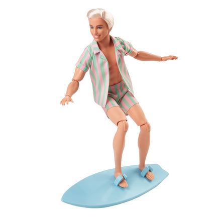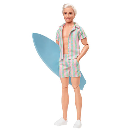 Greetings from Barbie Land! Inspired by Ken’s character in the movie Barbie, this Ken doll wears a beachy, striped matching set. With a surfboard in tow, he’s having the best day ever in Barbie Land! Celebrating the movie Barbie, this Ken doll makes a great gift for fans and collectors alike. Doll cannot stand alone. Colors and decorations may vary. Ages 3 and up.