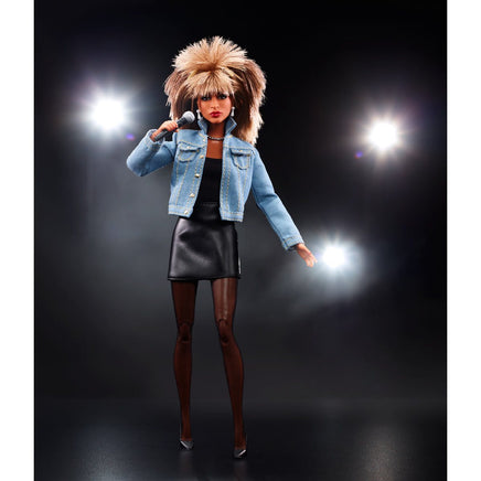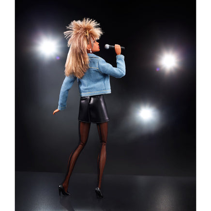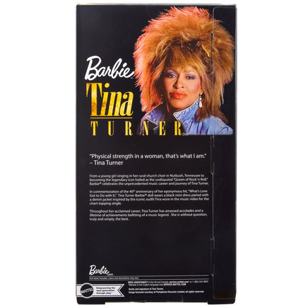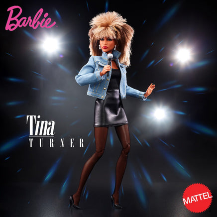 From a young girl singing in her rural church choir in Nutbush, Tennessee, to becoming the legendary icon hailed as the undisputed “Queen of Rock ‘n Roll,” Barbie celebrates the unprecedented music career and journey of Tina Turner. In commemoration of her eponymous hit, “What’s Love Got to Do with It,” Tina Turner Barbie doll wears a black mini dress paired with a denim jacket inspired by the iconic outfit Tina wore in the music video for the chart-topping single. Her signature hairstyle, drop earrings and black heels complete her look, and a microphone accessory and doll stand make this posable doll ideal for display. Doll is approximately 11 1/2-inches tall and cannot stand alone. Ages 6 and up.