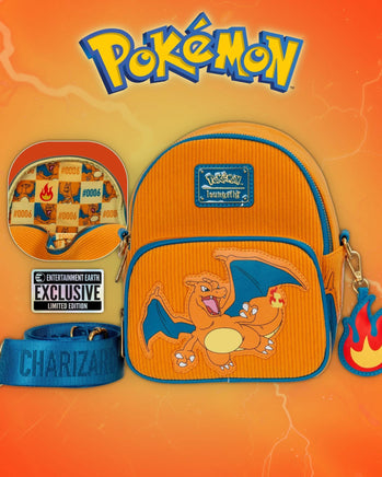Entertainment Earth Exclusive! Unleash the power of Charizard in style with the Pokemon Charizard Corduroy Convertible Mini-Backpack - Entertainment Earth Exclusive! Charizard is featured as appliques against a bright and bold orange faux corduroy material, that matches his fiery appearance! There is also a removable faux leather flame charm. This mini-backpack can be converted into a crossbody bag by adjusting the straps. The strap features Charizard's Pokedex number - #0006! This is a faux corduroy mini-backpack that features adjustable and removable straps, a faux leather charm, a front zipper pocket, appliques, and printed details with a coordinating interior lining!