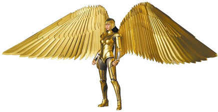 Based on the Wonder Woman 1984 film, the MAFEX Wonder Woman in Golden Armor is a highly detailed figure. The Golden Armor Wonder Woman figure features a high level of articulation for acting out all of your favorite scenes, along with closed and opened wings, and a golden Lasso of Truth. Two head-sculps are included, with or without the Golden Armor helmet.
